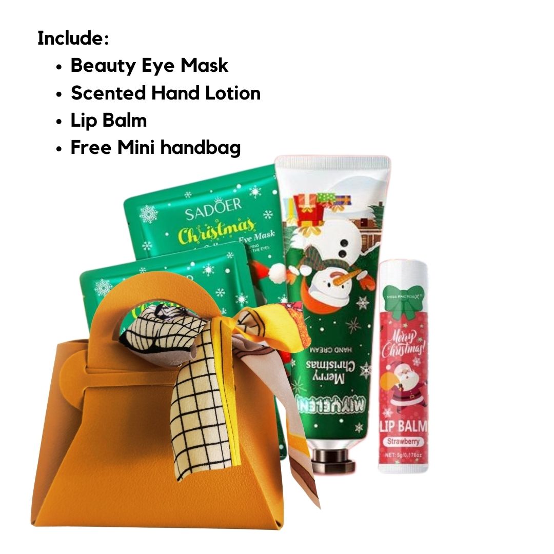 The perfect Christmas surprise for anyone who loves cute and practical holiday treats! This charming gift set comes with a festive lip balm, a nourishing hand lotion, and a soft relaxing eye mask — all packed in an adorable cutie mini bag.